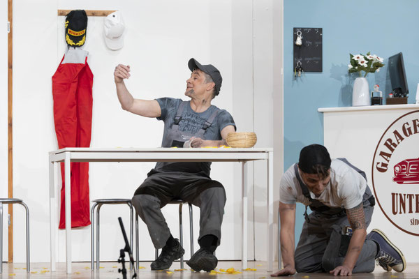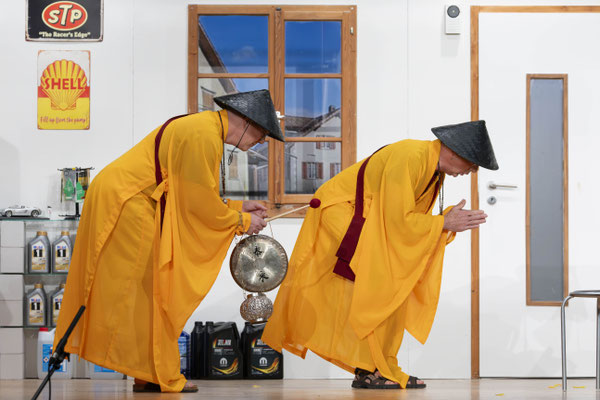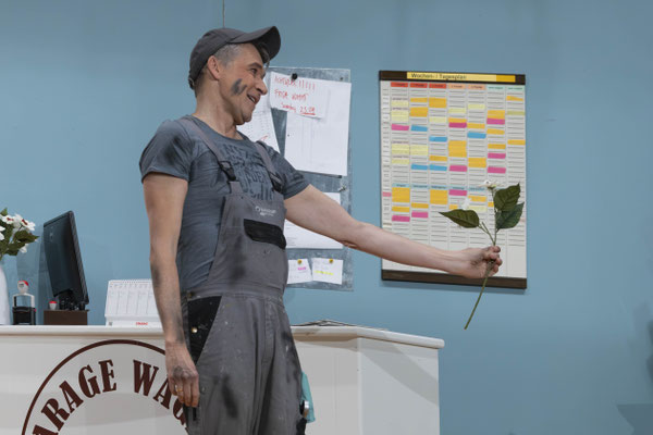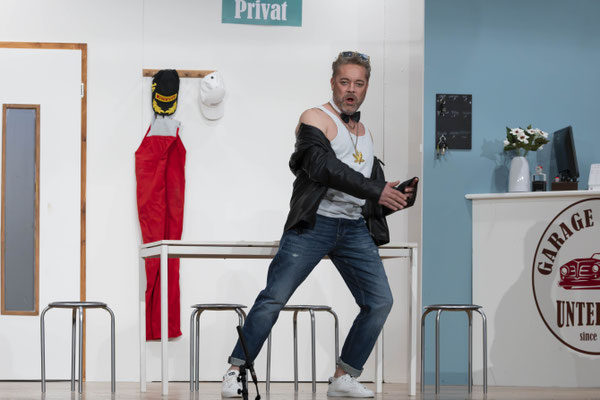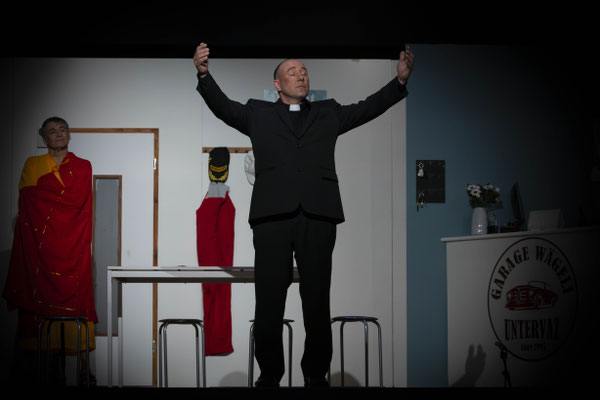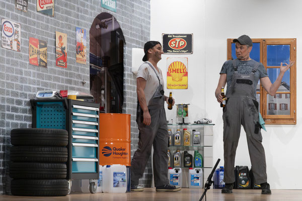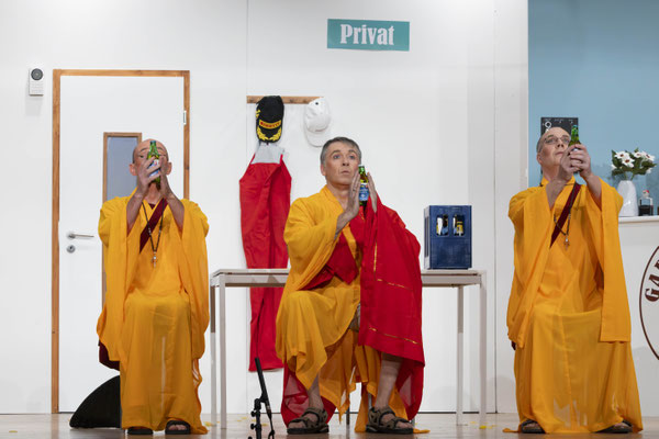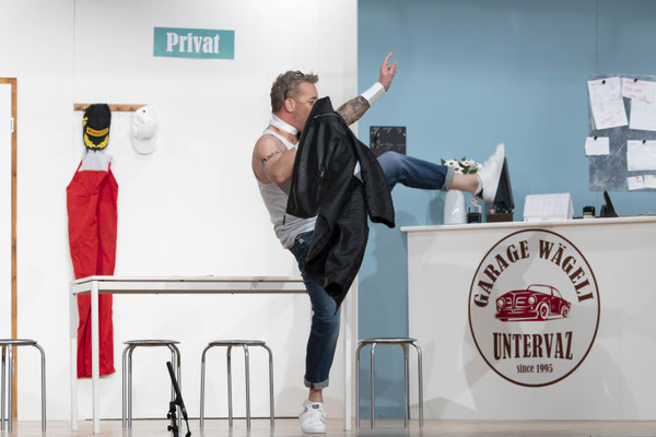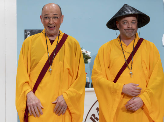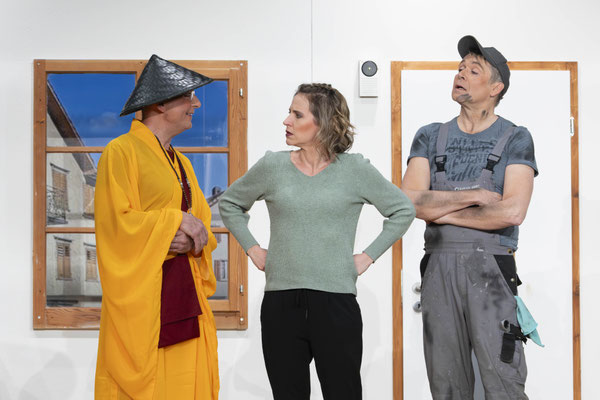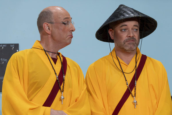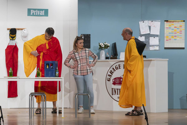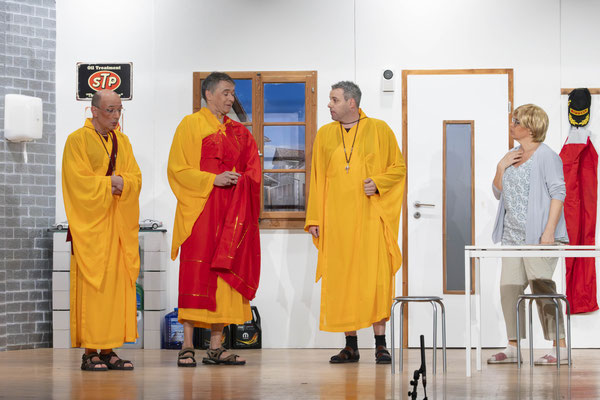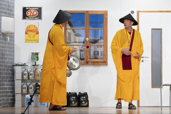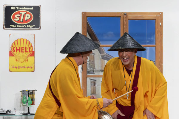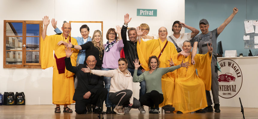 Unsere theatralische Reise ging dieses Mal etwas weiter und wir sind in fernöstliche Kulturen eingetaucht. Ja, ein geheimnisvolles Ora kel aus dem fernöstlichen Soja-Ashram beherrschte im Stück «A Guru für Do-Ping» den Garagenbetrieb von Automechaniker Heinz Wägeli und seiner Familie. Eigentlich lief in der kleinen Welt von Heinz alles rund. Das Geschäft schrieb schwarze Zahlen, das Ehe leben mit seiner Frau Heidi lief nebst ein paar kleinen Streitereien auch gut und Tochter Sandy war sein ganzer Stolz. Bis eines Tages mit der Ankunft seiner verbitterten Schwägerin Frida die Stimmung rasant umgeschlagen hat. Zudem erschienen aus dem Nichts zwei asiatische Mönche, die behaupteten, ein Orakel habe Heinz zum neuen Guru ihrer Bruderschaft bestimmt. Obwohl Heinz nicht die Bohne verstand, worum es bei diesem Orakel ging, fühlte er sich gewürdigt und das Gurutum stieg ihm gewaltig zu Kopf. Er nutzte die Anerkennung der Mönche, um seine maskulinen Bedürfnisse zeremoniell zur Schau zu stellen und weder der Gemeindepfarrer noch eine Sektenbeauftragte konnten ihn bremsen. Als er dann noch seinem leicht depperten Kumpel Mike aus der Patsche helfen sollte und sein Lehrling Roli fernöstliche Tipps in Sachen Dating bekam, war der asiatische Kupferkessel geflickt – oder wie der weise Y-Tong zu sagen pflegte: Nur die, die kommen, können erzählen denen, die nicht gekommen, was sie gesehen haben kommen.